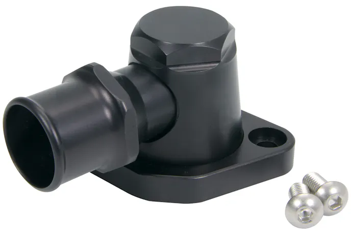 Allstar Performance black anodized billet aluminum water neck fit most Chevy V8 engines and accepts most standard thermostats and swivel a full 360 degree to simplify connection of LH and RH radiator hose to engine. Black anodized finish helps protect against corrosion. Stainless steel hardware and an o-ring sealing base flange assure a tight seal for a gasket-free installation. Available in 1-1/2”, 1-3/4”, -16AN and -20AN hose size applications.