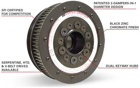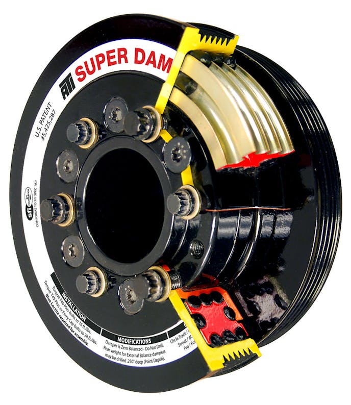ATI Performance Products‘ Super Damper harmonic dampers have become very popular with enthusiasts and racers in every category and class of racing. Providing engine protection, ATI’s Super Dampers are available for practically every GM engine and every style, including a supercharged damper with grooves machined into the outer shell to accommodate blower belts.