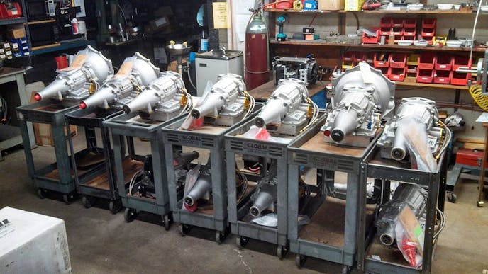 Seven double decker roll-away carts with 11 different ATI powerglides in various states of assembly are parked in a row with parts bins in the background. This photo caused us to wonder how many different versions of the powerglide transmission does ATI Racing make?