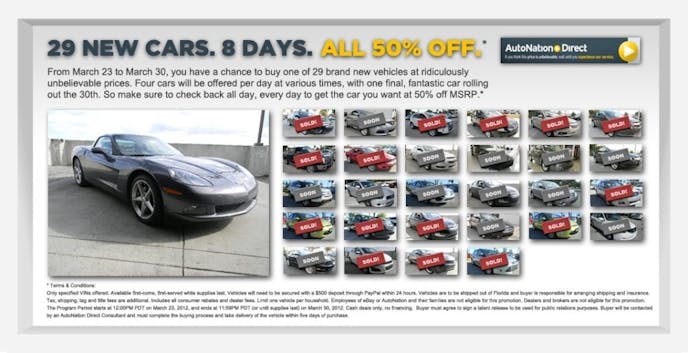 online seller of vehicles in the country and a branch of the automotive sales giant AutoNation. This week’s promotion is meant to bring awareness to the company’s presence on eBay.