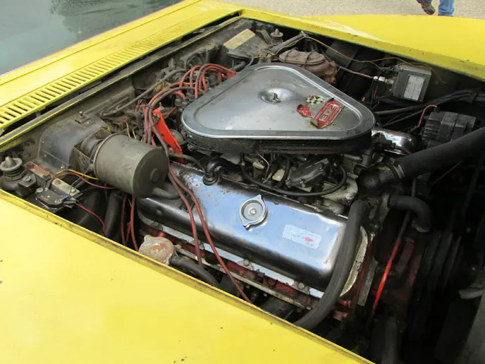 The car comes with extra parts as well. Original exhaust manifolds, smog pump, diverter valve with hoses, chrome distributor shielding, and spare tire and tub. Indicated mileage is 47K which appears to be original.