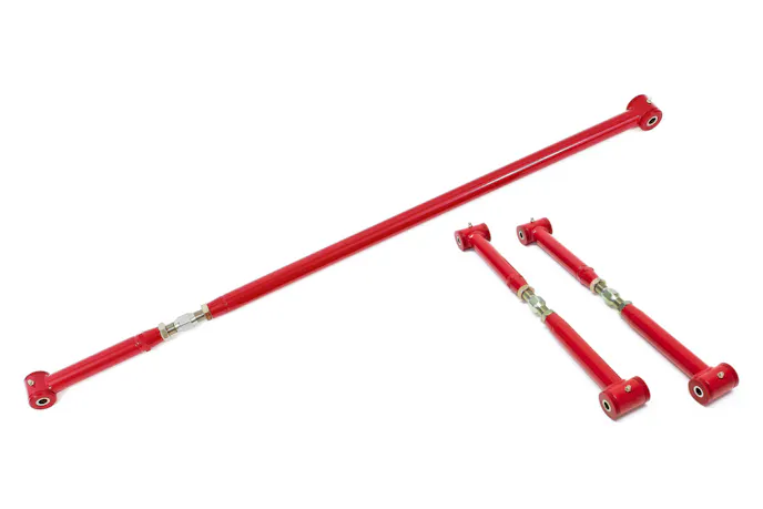 Launch harder, reduce wheel hop, and add cornering consistency on your 1982-2002 GM F-body with an adjustable Rear Suspension Kit from BMR Suspension. BMR’s polyurethane, on-car adjustable Rear Suspension Kit consists of a Panhard rod and lower control arms. Manufactured from heavy-duty DOM steel tubing, the on-car adjustable lower control arms and Panhard rod provide all the strength and adjustability you’ll need for any performance application. The adjustable BMR Rear Suspension Kit (RSK035) uses greasable, 95-durometer, internally fluted polyurethane bushings, which add a more responsive feel over the factory rubber bushings. BMR designed this kit to work well for street performance, drag race, and handling applications. The heavy-duty construction of the lower control arms and Panhard rod eliminate flex, giving you much improved repeatability on the street, starting line, or in the corners. This kit is the perfect upgrade for the enthusiast looking to improve performance, while maintaining acceptable NVH and ride quality. Installation time is 3-4 hours. Available in black hammertone or red powder coat. Proudly made in the U.S.A.!