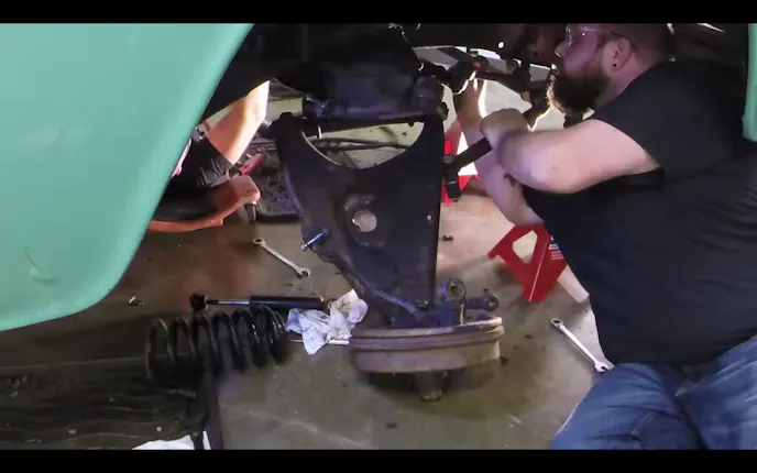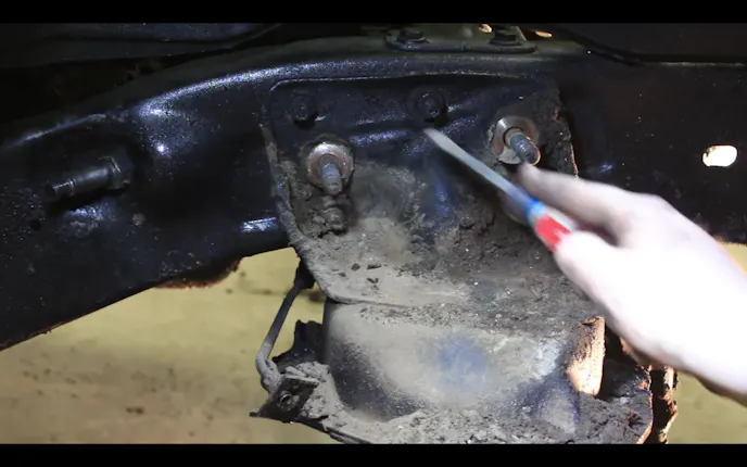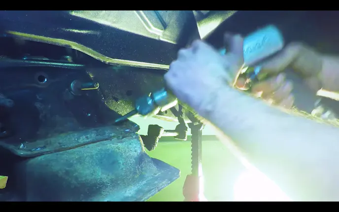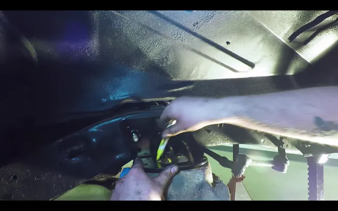 Once you’ve found the rivets, you need to remove them. In the video, Damien cuts an X into each rivet and uses an air hammer to chisel them off, and then punches them out. That’s probably the easiest way to do it. You can remove the rivets by hand, with a hammer and chisel if you have too, but it’s going to increase the timeline on your project. With the bracket off, you’ll need to place the new bracket on and use it as a template to cut the hole through the crossmember to make room for the shock and coilover. Once you’ve cut the hole, all that is left to do is install the suspension.