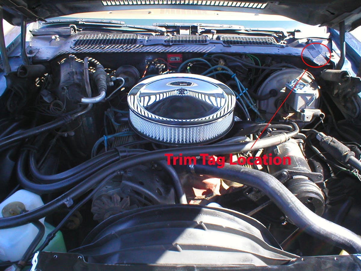 The cowl tag is located under the hood, on the upper right corner of the cowl. This tag is significantly more complicated than the VIN, but at the same time, is less complicated than most other cars. A cowl tag has roughly 32 characters for you to decode. A sample cowl tag will look something like this: