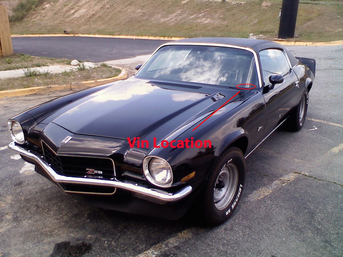 Let’s start by looking at the VIN using 1973 as our example. Starting in 1972, the VIN even includes an engine code that tells you what engine your car had from the factory. The VIN can be found on the driver’s side dash under the windshield, and is easily seen from the outside of the car. A sample VIN would be something like: 1S87T3N182396.