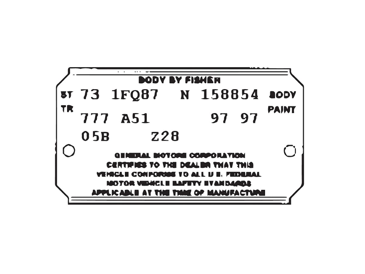 The top line can be broken down into four basic sections: 73-1FQ87-N-158854. The first two digits represent the year, the second five digits are a model description, the N is the Norwood, Ohio, assembly plant, and the last six digits are the Fisher Body sequence number. The model number itself can be broken into five parts, 1-F-Q-87. 1 for Chevrolet, F for Camaro, Q for sport coupe, and 87 for hardtop.