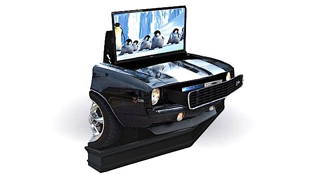 You’ve probably seen book shelves, couches and even wall hangings using pieces of old cars, or at least replicas of them, but this home theater is the first of its kind that we’ve seen. Formed out of what the TVLiftCabinets.com website states is “a 1969 Camaro RS/SS car front,” the home theater features the company’s Uplift 3700 commercial grade lift that will lift and lower up to a 55-inch, 130-pound TV from the engine compartment at the push of a button. The Camaro system also features a front grill that opens up as a drawer for electronics and sound bar storage.