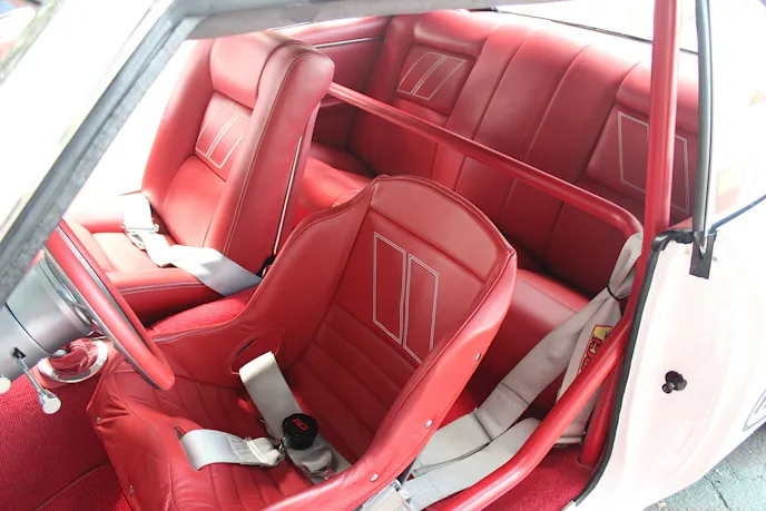 The interior of the car certainly grabs your attention as its a bright red leather interior contrasts against the white paint. Stitched into every seat is the iconic Grand Sport stripes, which breaks up the red and brings in the stripe on the side of the car. Even though the interior is red hot, a complete Vintage Air kit keeps the passengers comfy at all times inside.
