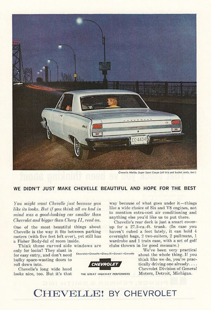 Looking at some of the original advertisements from 1964, Chevrolet was really proud of this Chevelle. They had a huge push in 1963 for the debut. The claimed that you can easily park it between parking meters, with five feet of space leftover. They were really proud of the 27.3 cubic foot trunk claiming that “it can hold 4 overnight bags, 2 two-suiters, 2 pullmans, 1 wardrobe and 1 traincase with a set of golf clubs thrown in for good measure.” What they mean is, there is a huge trunk that can fit just about anything you want in it.