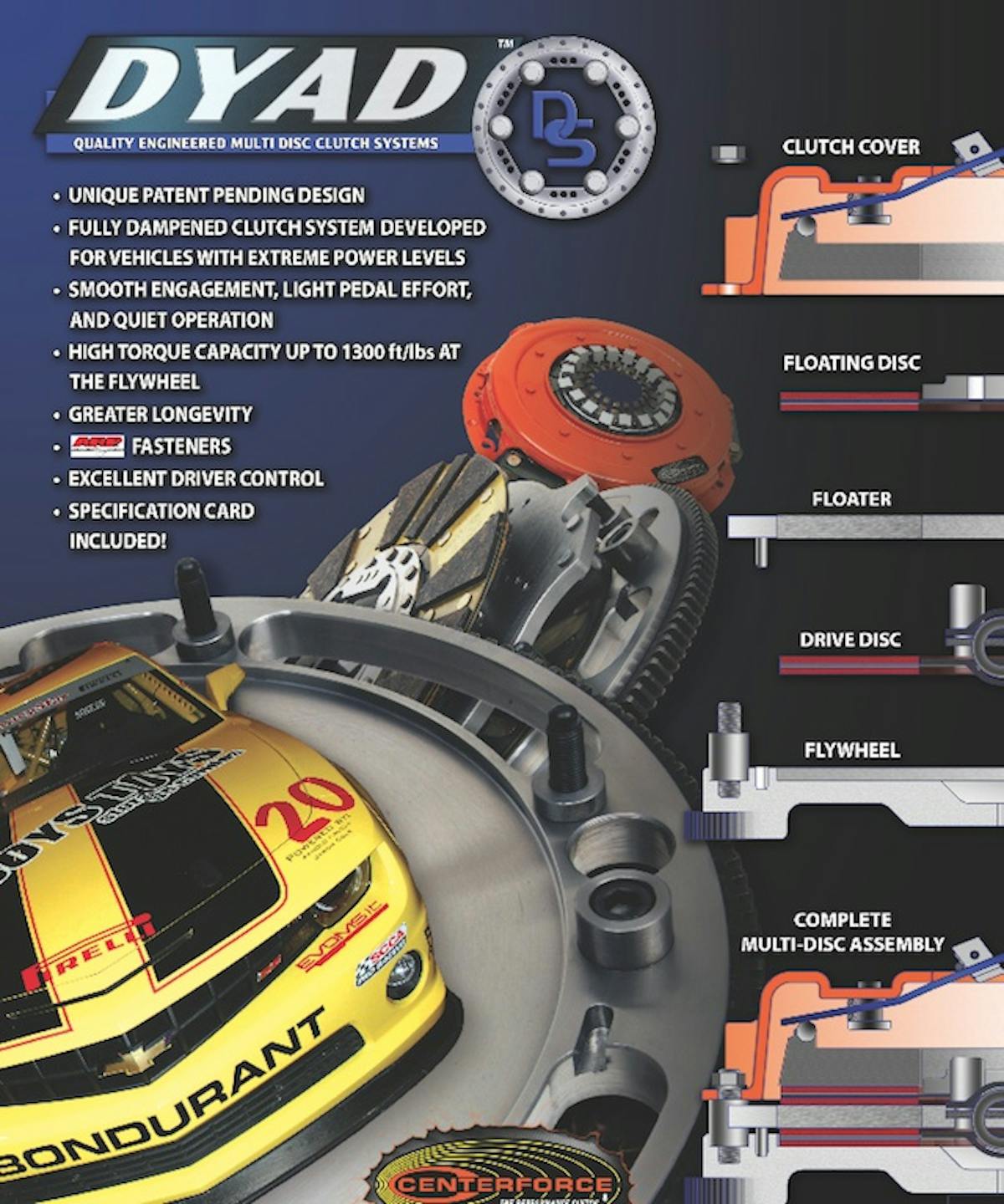 Though smooth and quiet the assembly may be, it’s dampened construction is good for a staggering 1,300 pound feet of torque, and a set of ARP fasteners holds the clutch assembly into place.Centerforce’s DYAD clutch also offers superior drive control, as it features lighter pedal resistance, greater longevity and each kit features a specification card for your own information and peace of mind.