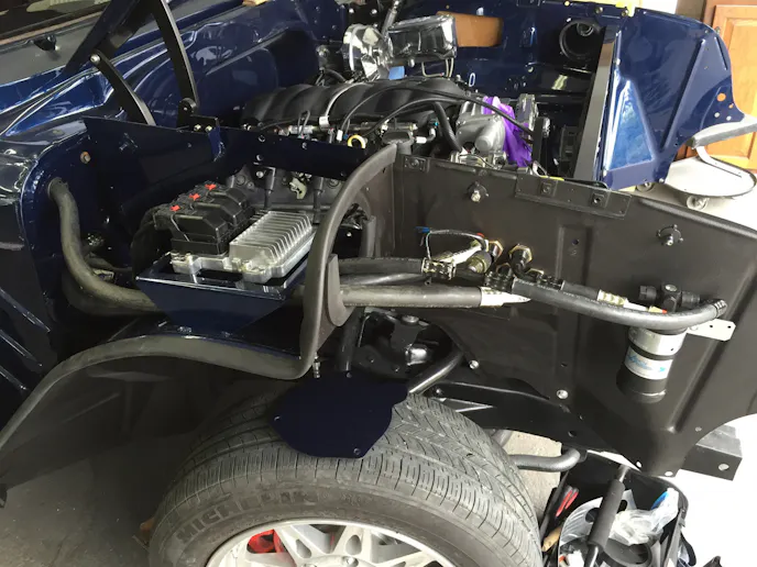 After the car was painted, the big challenge of fitting the new engine and transmission without scratching, dinging, or otherwise damaging his freshly painted firewall began. In addition to the LS engine and transmission, the car also features a CPP big disc-brake kit, Flaming River rack-and-pinion steering, Concept One front pulley system, and an American Auto Wire harness.