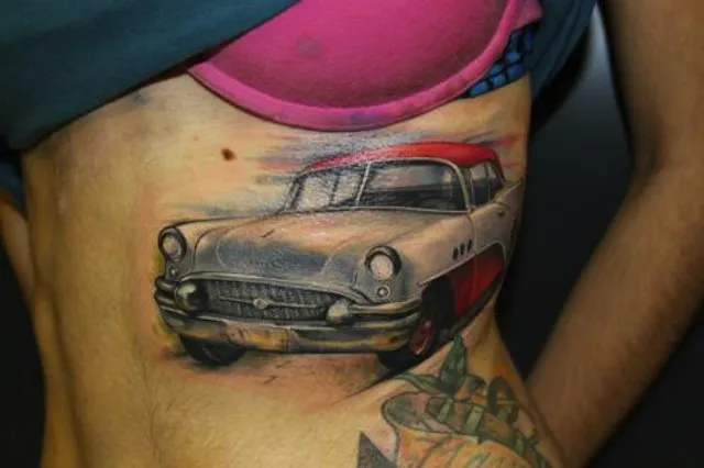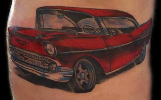This version of a 1957 Chevy is the work of artist Brooke Cook of North Little Rock, Arkansas. Photo from {link=https://www.galleryoftattoosnow.com/PrimalUrgeTattoosHOSTED/images/gallery/57-chevy4.jpg}www.galleryoftattoosnow.com{/link}