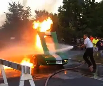 There’s few things that fiberglass hates more than gasoline-fueled fires. During an impromptu burnout contest, this blown and bad ass Corvette Stingray (we’re thinking late ’70’s), caught fire when a fuel line broke loose, dousing the scalding engine and quickly catching ablaze.