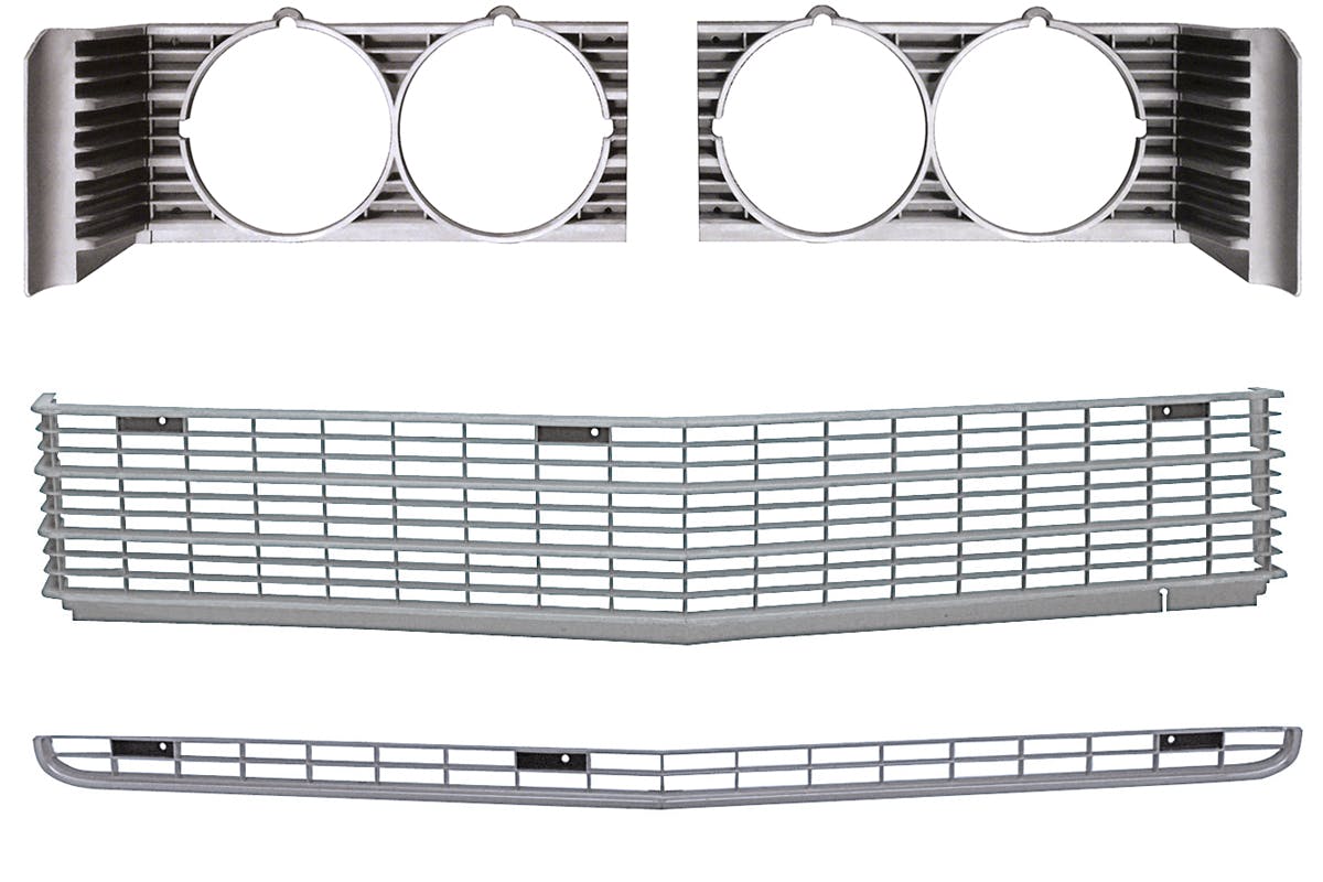 Each OER upper grill assembly is constructed of injection-molded polymer to exact factory specifications, and features correct silver paint with black accents. The lower grill assembly is also injection-molded and painted in correct silver and black finish, accurately matching the original GM part. Left- and right-hand headlamp bezels are also available for 1969 Impala and Full Size Chevy models. These bezels are injection-molded to continue the pattern and finish of the upper grill, and include attached headlamp extension panels for a factory-style fit.