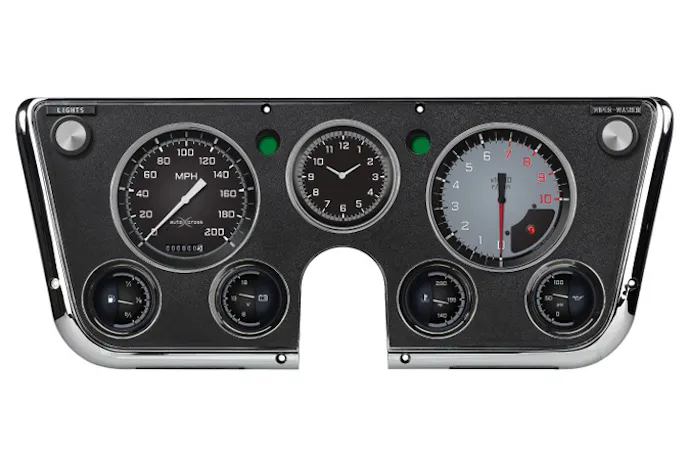 Classic Instruments is pleased to announce the all new AutoCross package is available for 1967-72 Chevy and GMC trucks. The CT67 AutoCross package features include: 4 ⅝″ 200 MPH Speedometer w etched diffuser ring 4 ⅝;″ 10K Tachometer w etched diffuser ring & extremely bright, red, LED shift light; 3 ⅜″ Clock 2 ⅛″ vertically oriented Fuel (0-90), Oil, Temp, & Volt gauges with “eyelids” and ISO symbols; Pool cue pointers Sport appearance w clear, concise numerals & indices; High quality OE style reproduction bezel; All necessary sending units included; Wiring Harness External shift indicator light controller. Available in Gray or Yellow.