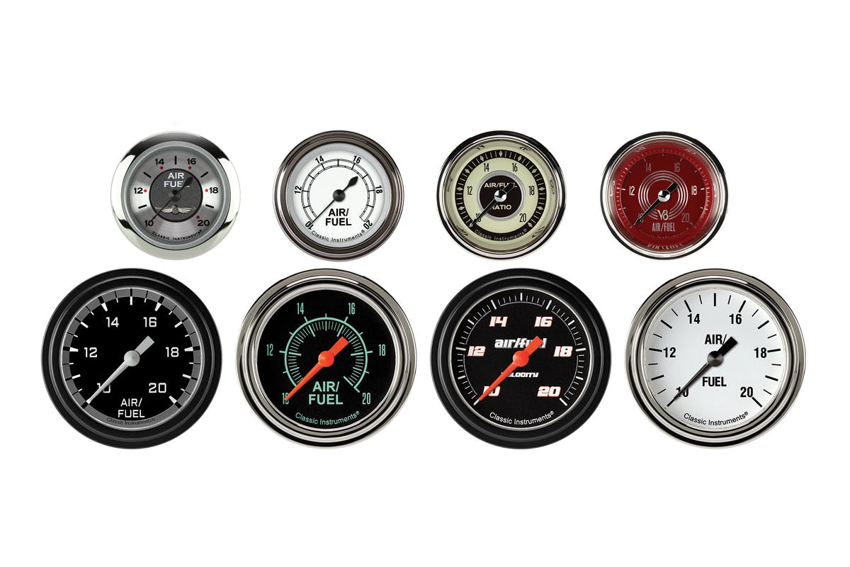 Classic Instruments now offers a full-sweep wideband air/fuel ratio gauge, available in both the 2 1/8″ and 2 5/8″ sizes across all 18 design series. The new instrument includes all of the great features offered on the other full-sweep instruments such as the rugged air-core movement, analog .5–4.5VDC output for data logging systems, and the programmable warning indicator light. Additionally the gauge comes complete with a BOSCH wideband air/fuel sensor, FAST™ wideband controller, and necessary installation hardware.