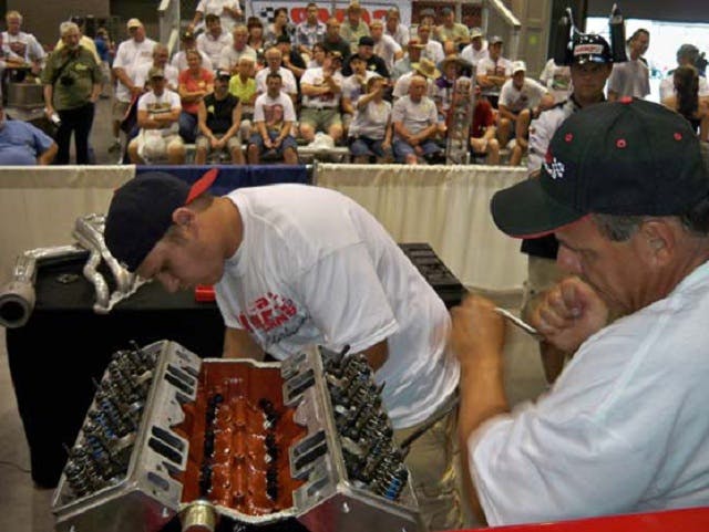 Engines aren’t terribly complicated devices, especially when you’re used to building a whole bunch of them in short order. Still, engine building isn’t usually the kind of hobby you just rush through; one minor mistake can ruin the whole motor. It takes a steady hand and a keen mind to throw together an engine in short order, and because car guys are just naturally competitive, engine building has morphed into its own kind of competition.