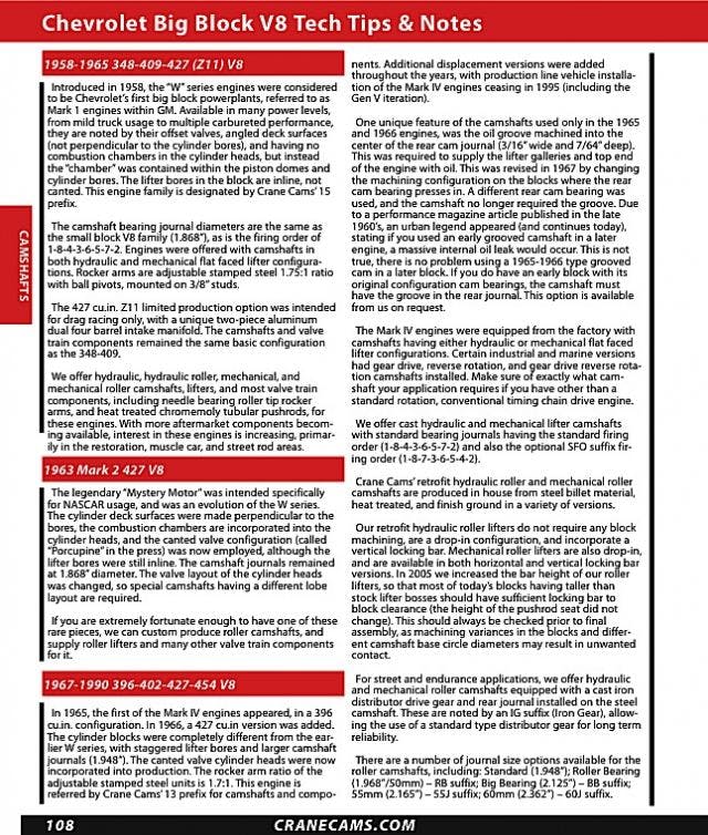 Secondly, there’s also a page that’s all about the Chevy big-block. This page is for the big boys that range from the 1958 “W” series (also known as the Mark1) all the way up to today’s 8.1L 496 and everything you could possibly imagine in between. Just like the small-block Chevy page, the big-block page gives plenty of tech info and lots of foot notes about everything as far as generation changes goes such as oiling and bearings and of course, lots of camshaft information.
