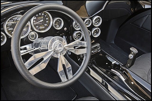 Inside, the car is just as unique, featuring a one-off custom steering wheel attached to an ididit steering column, custom steel dash with carbon fiber gauges from Auto Meter, and a custom center console fitted with a carbon fiber B&M shifter. Other interior amentities include a remote starter, push-button door latches and a touch-screen DVD player.