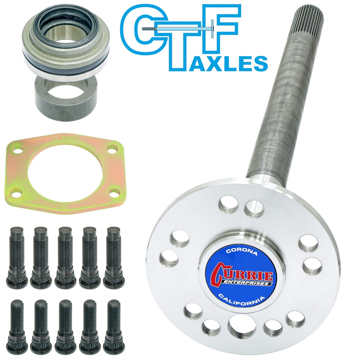Wheel-bolt patterns are dual drilled for 5 x 4 1/2 and 5 x 4 3/4, and a retainer-access hole is also drilled. All CTF axles come with a complete installation package that includes one set of five 1/2-20 Ford-style wheel studs, one set of five 7/16-20 Chevy-style wheel studs, one set of tapered-roller large axle bearings with race, seal, and collar, and one heavy-duty late-model large bearing-style retainer plate.
