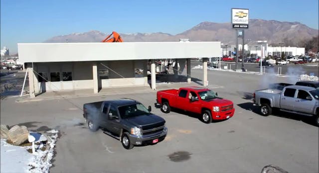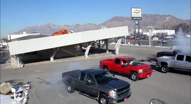 Dealership Uses Four Chevy Trucks To Demolish Old Lot