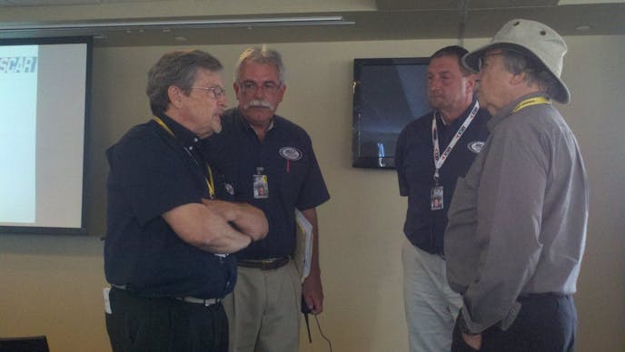 Dr. Melvin never tired of spreading the message of driver safety. Here he is talking with ARCA members in 2014, to help get the word out. Dr Melvin is on the far right, wearing the hat. Photo from {link=https://www.arcaracing.com/articles/1989990-safety-leaders-encourage-arca-drivers-to-spread-the-message-about-safety}www.arcaracing.com{/link}