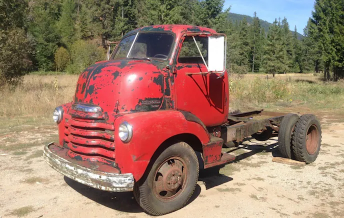 We found this 1949 5400 COE while cruising on eBay and were taken back. For being a work truck and unrestored, it’s in remarkable shape. Sure there is some rust here and there, but we have seen way worse. Having no bed on the truck leaves a world of possibilities. You could do a real neat wood bed with stakes on the side. Or even better, make a ramp truck so we could tow around a wicked Hot Rod.