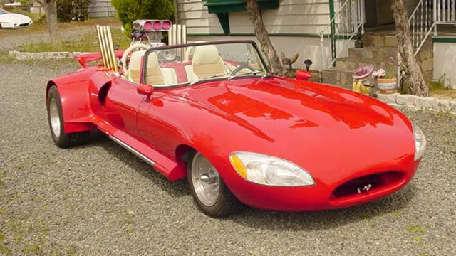 That’s because the red E-Type’s rear has been modified to receive a blown, Cadillac big-block where the Jag’s trunk once resided. The headlights are from an ’04 Taurus, and Jalopnik’s Tom Joslin bemoans the Chevy powered Jag’s rear mods and front facelift,