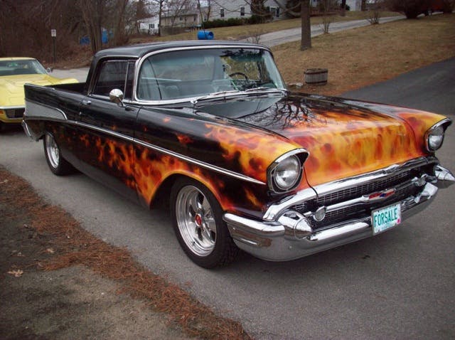The fit and finish work looks great, and the flaming hood paintjob is a nice touch on the otherwise glossy black body. There are definitely hints of the short-lived Chevy Nomad in here, and we can’t help but think that, had GM built an El Camino in 1957, it would have looked a lot like this.