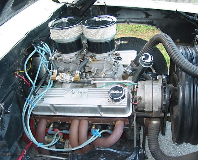 The engine bay houses a mild 383 stroker motor built from a 4-bolt main block and has a hydraulic cam, 2.02 valve heads topped off by a vintage correct dual quad intake and, matching Edelbrock carburetors and of course early Mickey Thompson valve covers. And we cant forget the Muncie 4-speed that sends power to a 4:56 geared posi rear end.