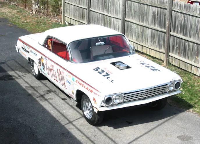 We found this really cool ’62 Chevy Impala over on eBay restored to look like an old nostalgic super stocker. It reminds us of an era when Butch Leal and Dyno Don Nicholson used to race these old Super Stockers. These early drag cars had one of a kind paint schemes like the old World War II fighter planes had, along with their own nick name.
