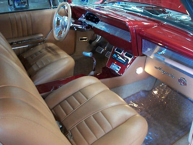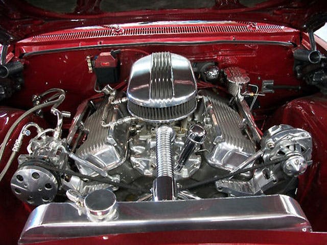 Ross Racing pistons and a Isky competition cam were added, as well as dual Carter 4-barrel carbs on a polished intake manifold. In fact, looking under the hood of this Chevy, you’re not going to see a lot but the glare from polished metal, like the valve covers, accessories and 4-row aluminum radiator with electric fan.