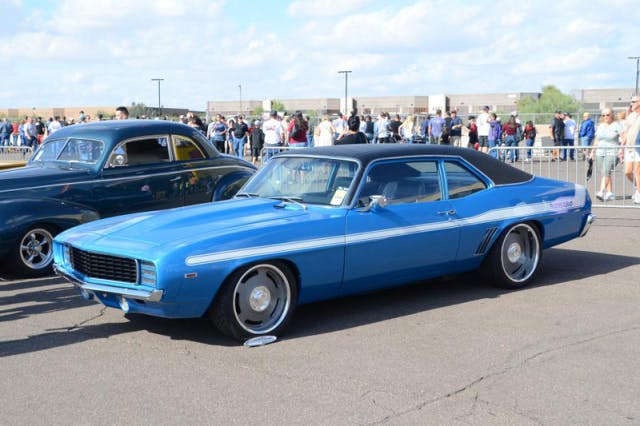 The focus, according to Capen, was “blending the Camaro doors and quarters to make it all flow kind of like GM engineers would have done in the early 70s.” With the doors and quarter panels in place, and all of the sheet metal massaged the right way, the Drew Brother’s Customs crew painted the new creation with PPG blue topped with a white pearl Yenko stripe with “Nomaro” written on it. The rear bumpers were sectioned to tuck into the body better and Camaro tail lights were used in the rear.