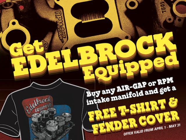 Announcing its brand new “Get Edelbrock Equipped” promotion, Edelbrock is giving consumers who participate a free exclusive t-shirt and fender cover with the purchase of any new Edelbrock Air-Gap or RPM intake manifold. Don’t hesitate as this promotional offer lasts from April 1, 2015 to May 31, 2015.