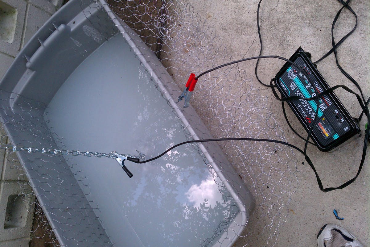 Mix a solution of 2 1/2 gallons of water to 1/4 to 3/8-cup of your washing soda in your container. Next, place your piece of sheetmetal in your bucket so that part of it is in the liquid, and a clean, rust free portion reaches above the bucket. Ultimately, the sheetmetal must not touch the part(s) to be cleaned. Connect the negative terminal of the battery charger to the piece to be cleaned, and place it into the solution. The cleaning process works best if the metal is suspended in the solution, and not setting on the bottom of the container. Whatever you do, make sure the piece being cleaned does not touch the sheetmetal.