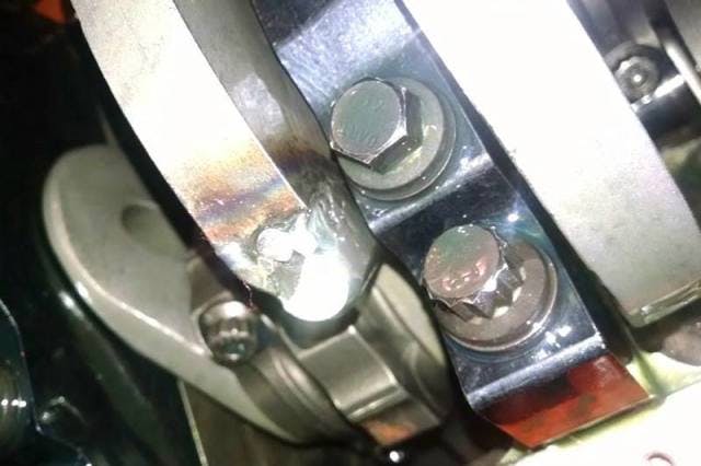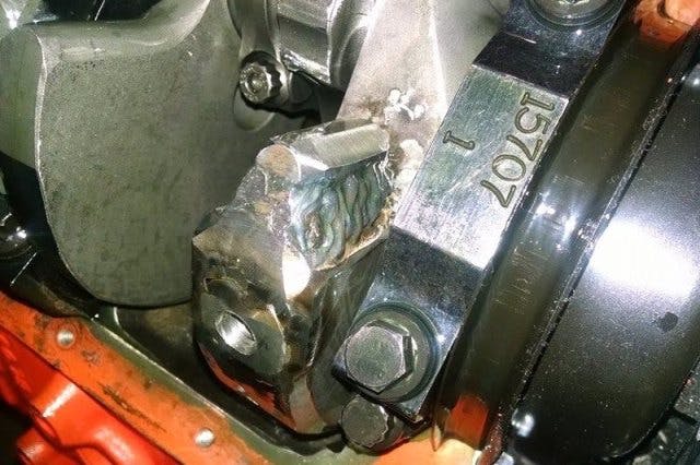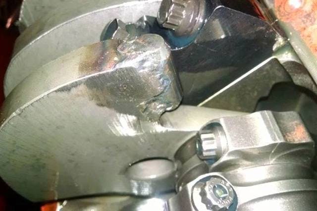 Hamilton also pointed out the crankshaft balancing job in the engine. Many of his facebook friends commented on the crude welding and grinding. In one instance, the weight was pressed into the crankshaft’s counterweight without a single weld to hold it in place. Another Facebook friend pointed out the mis-matched crankshaft main bearing bolts.