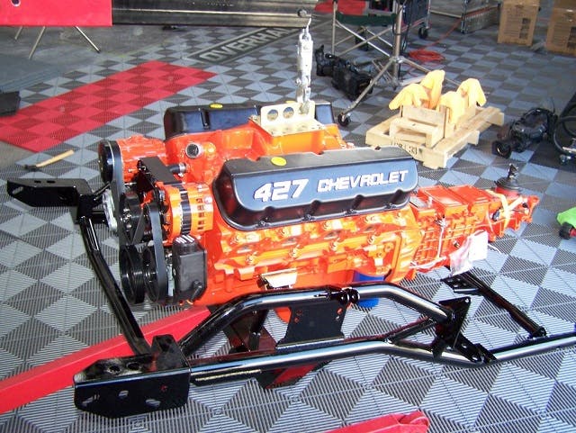 The drivetrain consists of a 480 HP, big block Chevrolet 427 crate motor backed up by a Tremec TKO-600 5-speed gearbox from Bowler Transmission. The old stamped steel sub-frame was ash canned and replaced with a powder coated, tubular IFS unit and the rear end was upgraded with a torque arm solid axle sourced from TCI Engineering.
