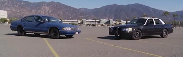 For the first event, the Caprice and Crown Vic face off in a small “drag race” in a mall parking lot in Santa Arcadia, CA. The Vic gets a good start both times but fails to outrun the Caprice’s overwhelming speed, giving the latter the straightaway advantage with its slightly higher horsepower.