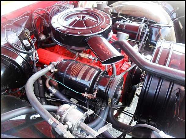 Photos of the engine bay do not conclusively show what type engine is in the Impala but it could be a 283 Turbo Fire V8 that came equipped in many of these models.  While the 283 V8’s came in a fuel injected version, this one appears to be a single carburetor model.