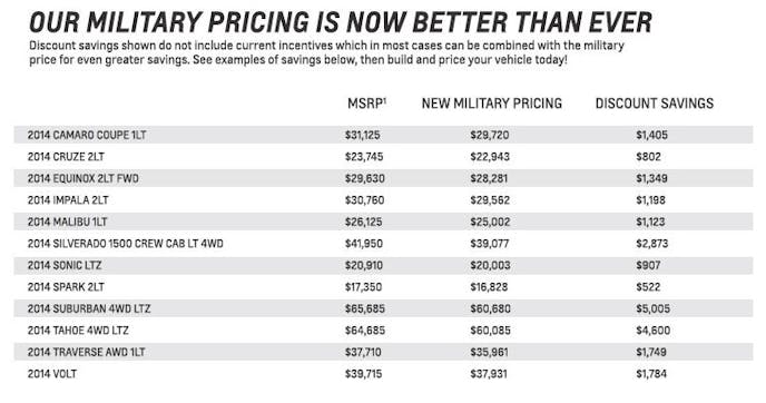 At the GM Military Discount Program web site, active and reserve members of the U.S. Air Force, Army, Navy, Marines, National Guard and Coast Guard can get additional information about their new-vehicle discount, in addition to specific, model-by-model examples.