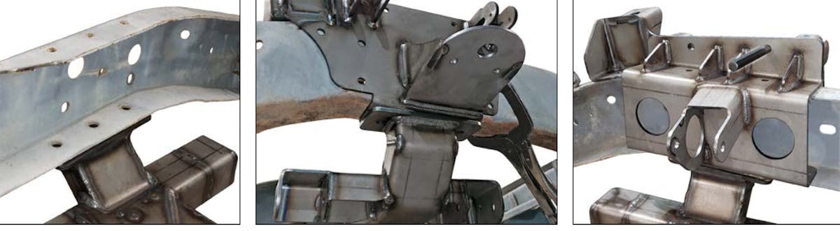 The fabricated crossmember integrates reinforced mounts for all suspension components and when bolted together, completely captures the stock-frame channel to form a larger and stronger section of the frame.
