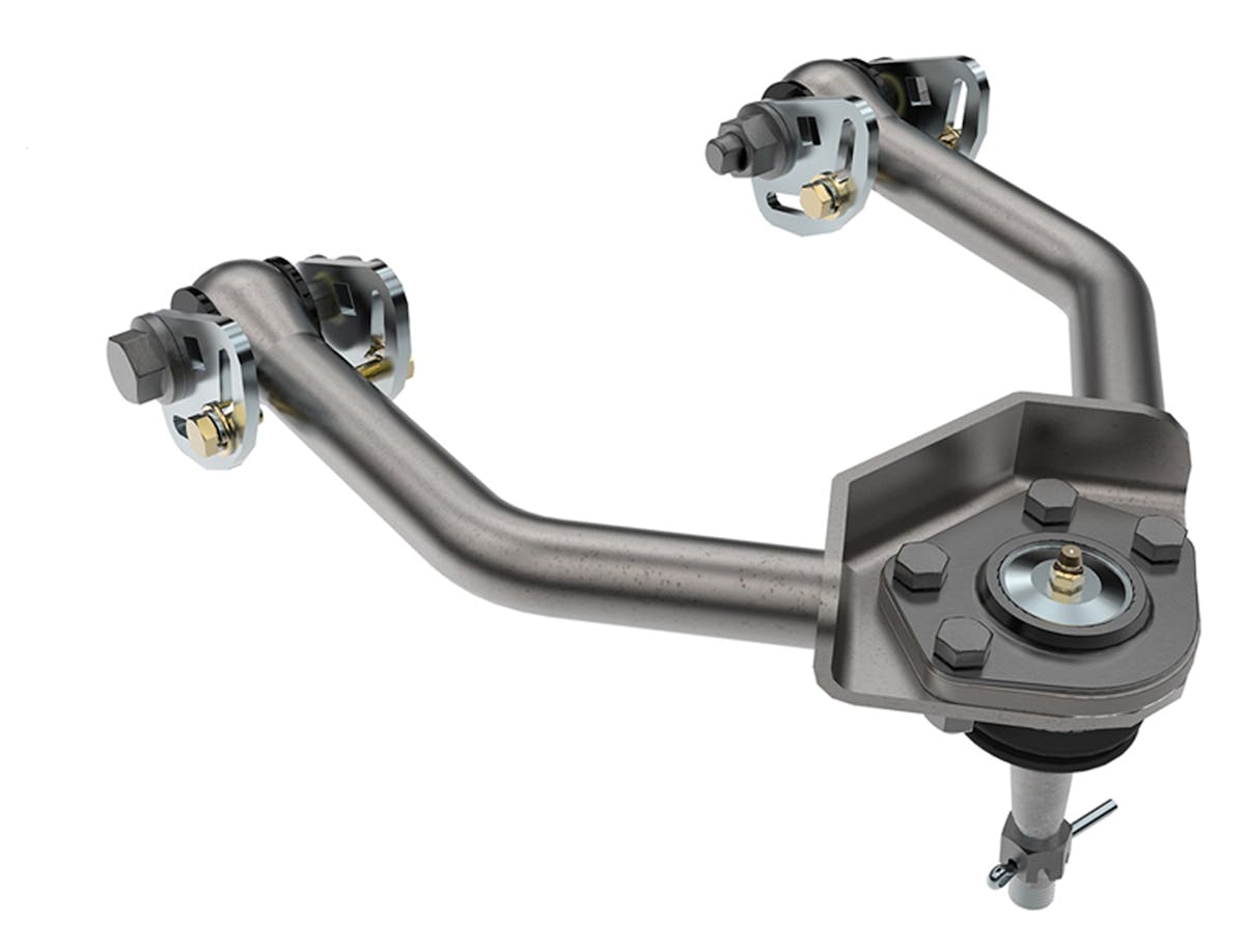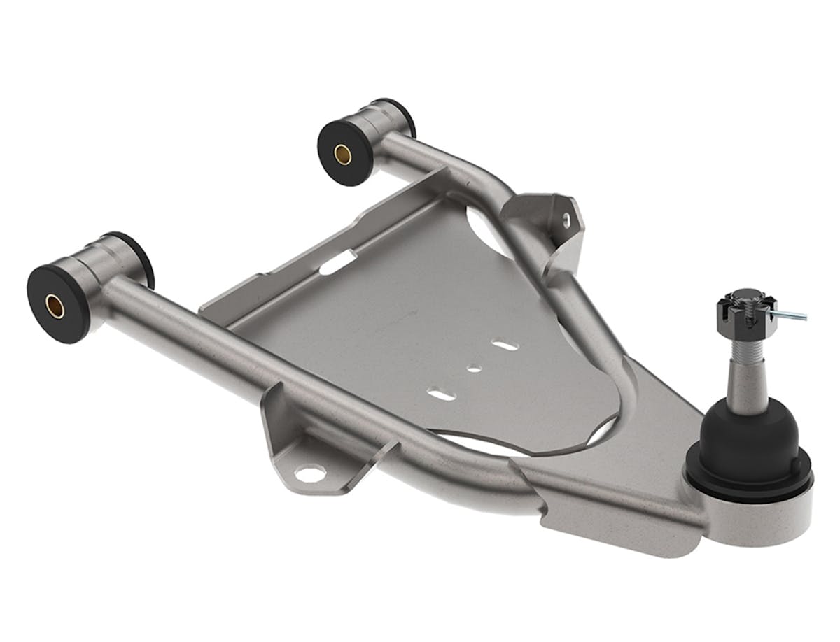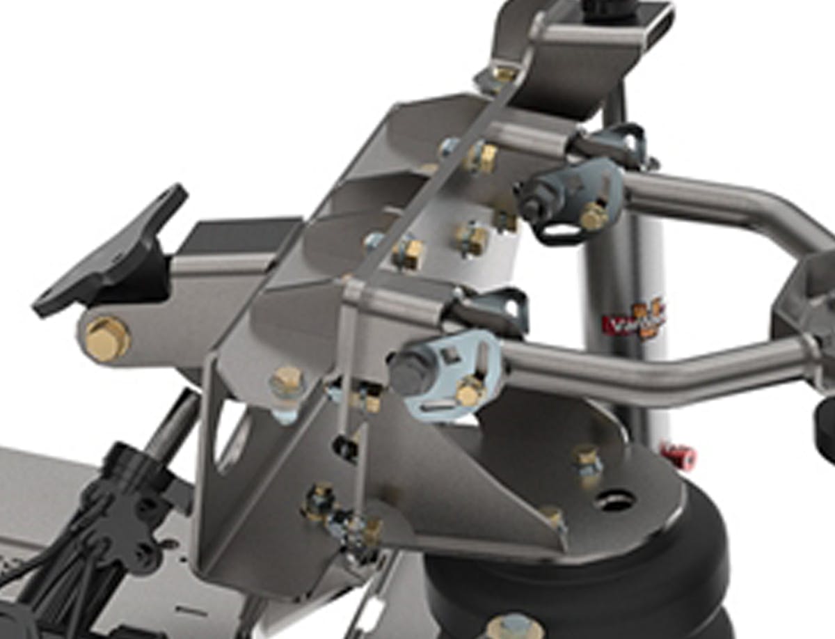 The lower control arms are also a work of art and feature a continuous-length construction. This the lower arm is formed by a single piece of tubular steel. This is much stronger than units welded together. Like the upper control arms, the lowers feature a stronger, folded-gusset design for bag-plate mounting as well as ball-joint housing and accessory mounts.