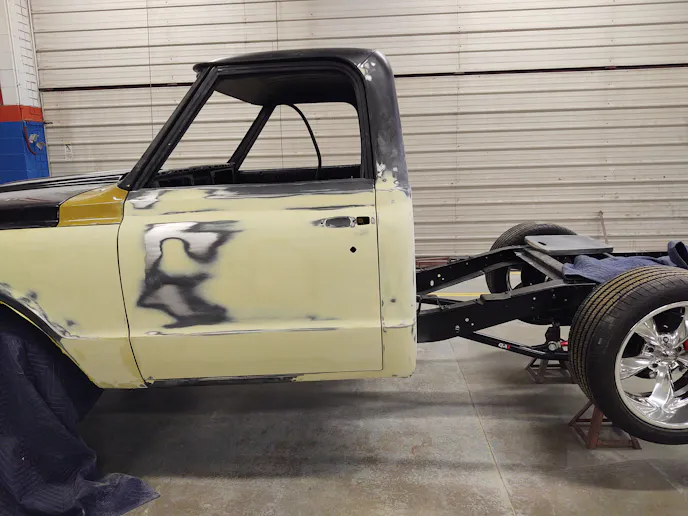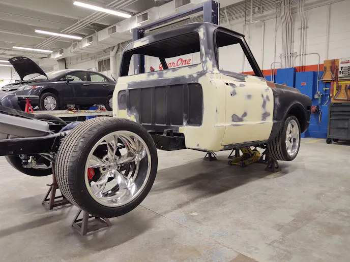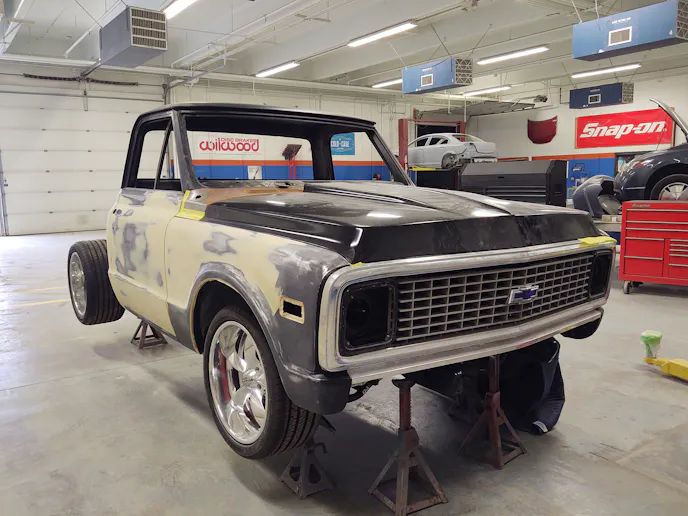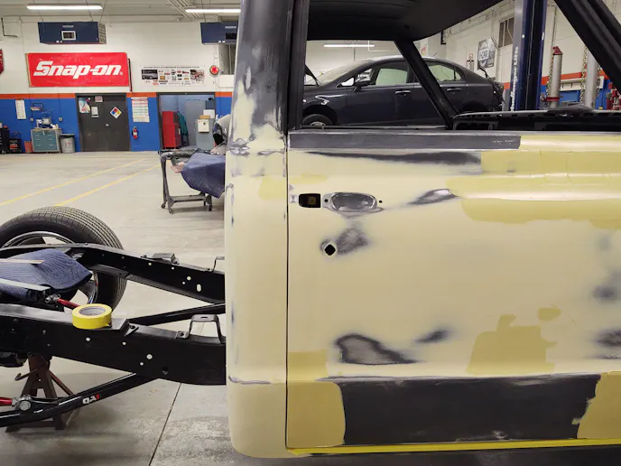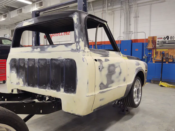 The Hawkeye students will be using AkzoNobel two-stage paint for the final color of their C10 truck, but there are many stages in the process of getting the perfect finish without overspray in areas you don’t want it.