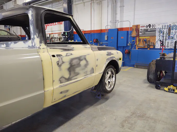 In the C10’s body makeover story, we mentioned that the only way to get a great finish is to start with a proper foundation. The students worked their magic under the watchful eye of instructor Terry Van Dyke to get each panel as straight as possible using linear block sanders and a lot of elbow grease.