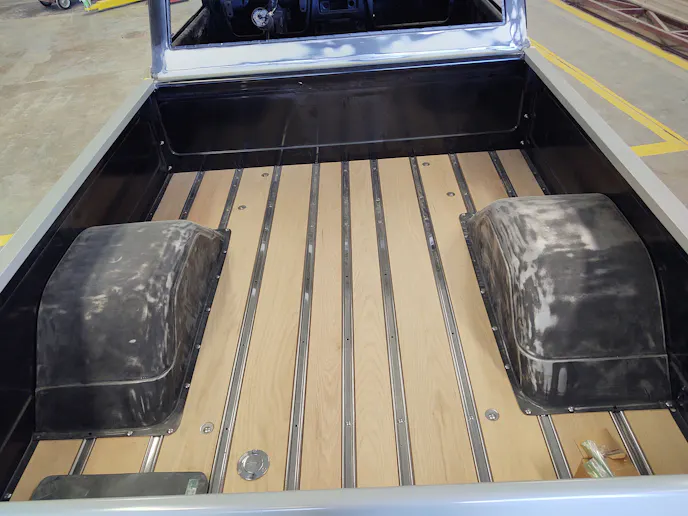 The C10’s body went back on the completed chassis so the students could compare how everything fit once bolted in place. That meant everything; doors, bed, lights, and even the grille were installed to compare gaps. And, this is the time to make sure every surface is as smooth as can be, even in those areas you may not see once the vehicle is assembled.