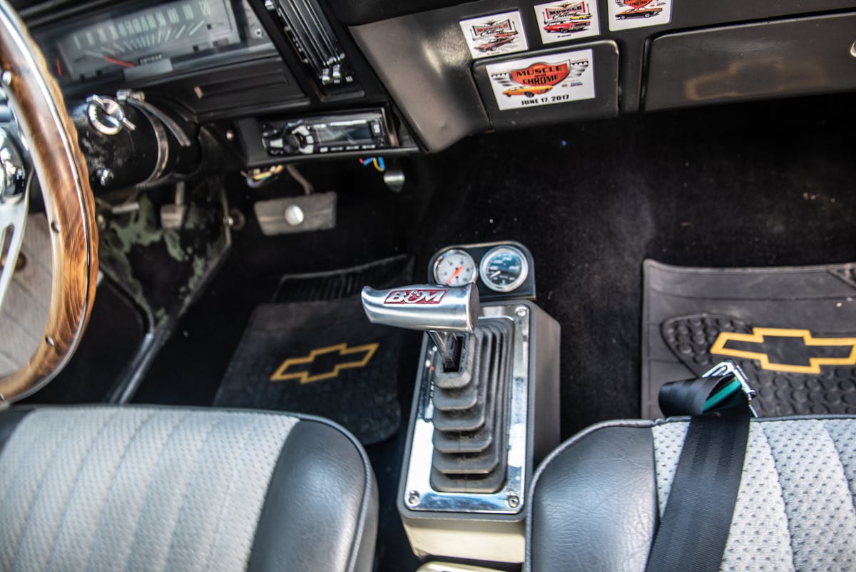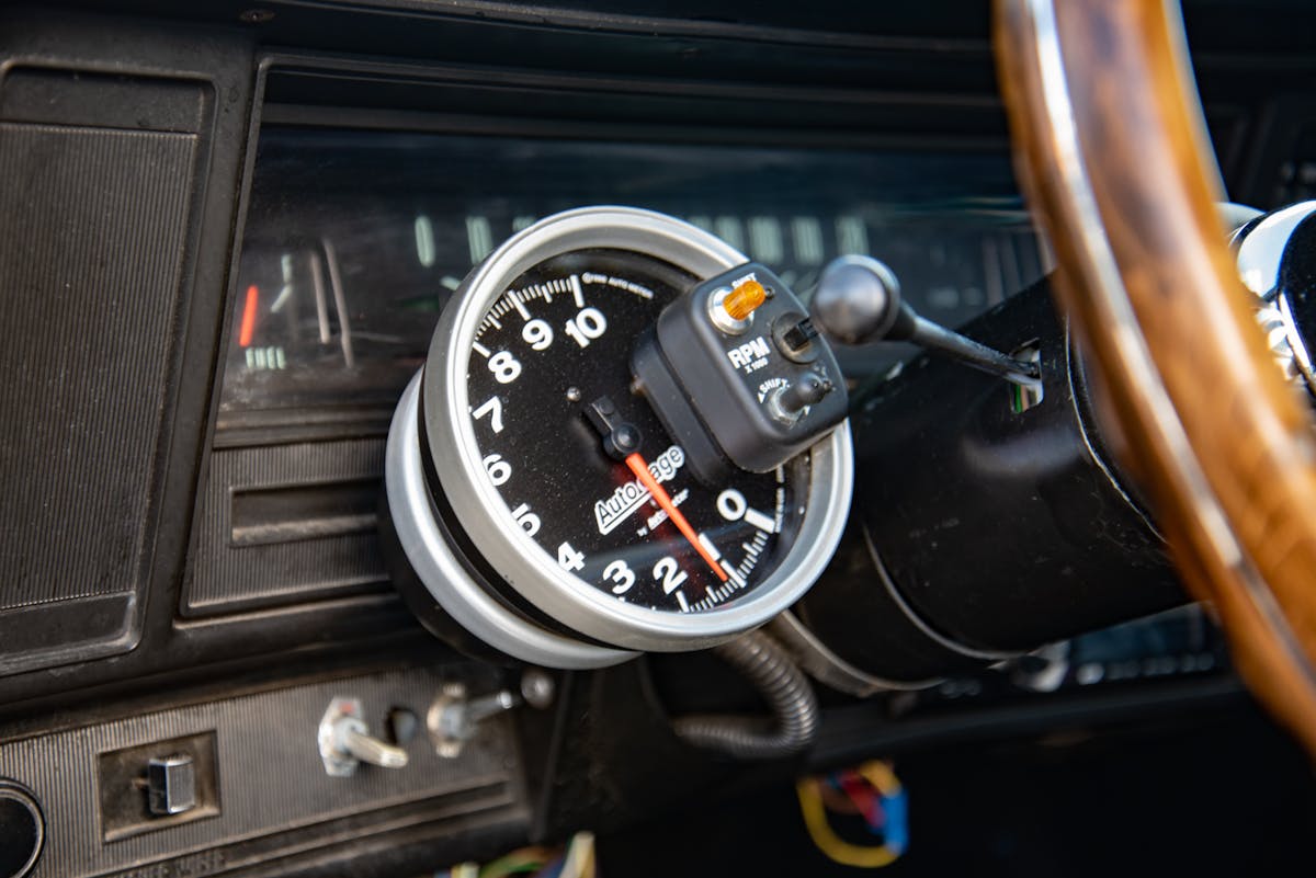 The custom upholstery matches well with the exterior, and features grey vinyl with silver cloth inserts. It looks great and the style flows from the outside in. The interior doesn’t call too much attention to itself or detract from the overall appeal of the rough-and-tumble look of the exterior. It adds cool style by maintaining a simple look that goes a long way with the classic B&M floor shifter, shift shroud mounted gauges, wood steering wheel, and the column-mounted tach.