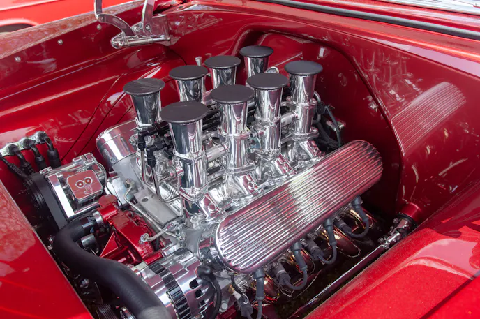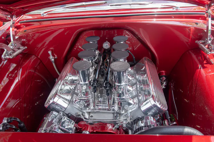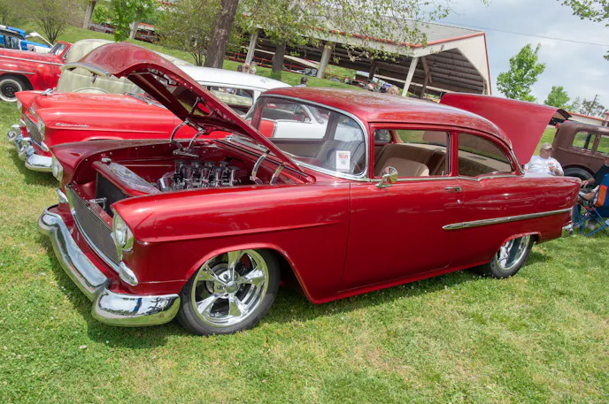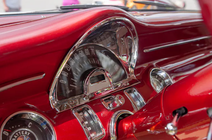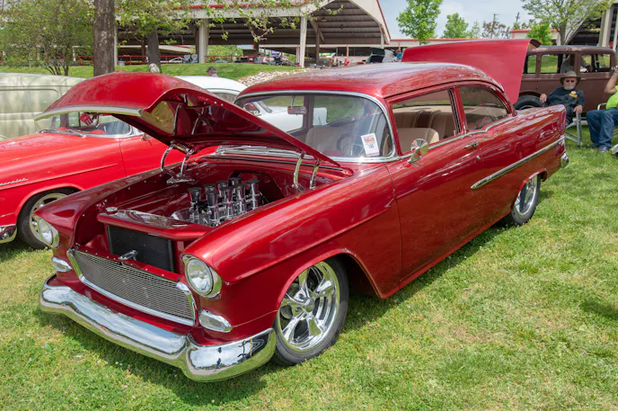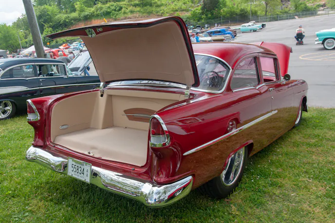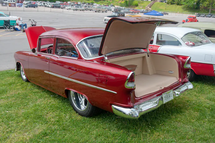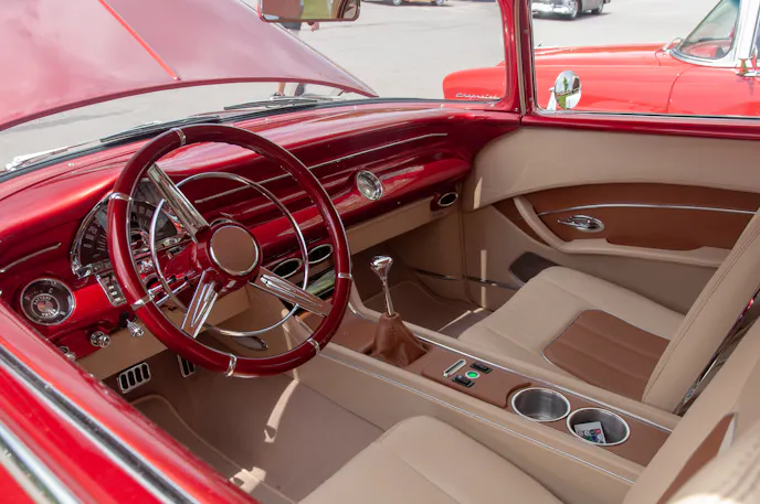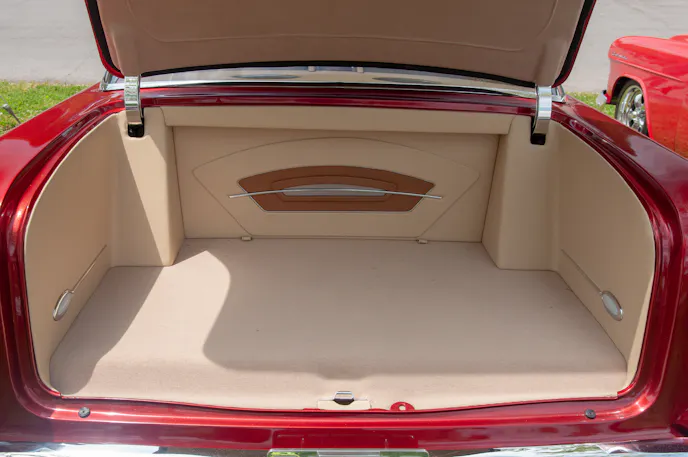 In addition to the rain gutter modification, the rear bumper of a nomad was cut to fit flush to the body. They also installed halo-style headlights, a custom made, straight-bar front grill, and the hood and trunk have been shaved. The color is a Vibrance Candy Apple Red. “When you get it out in the sun, it has a real fine sparkle,” Condon said. The outcome of all that work is a classic looking, yet subtly modernized 1955 Chevrolet.