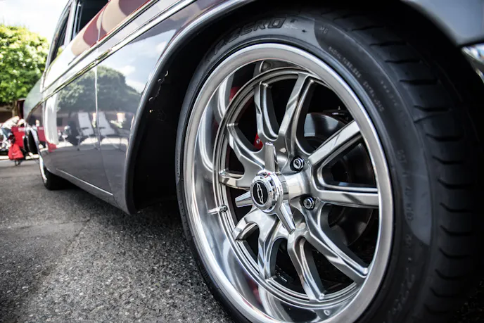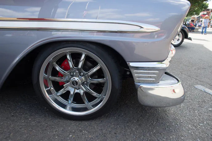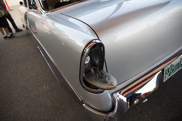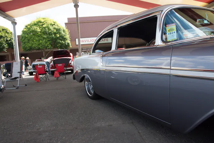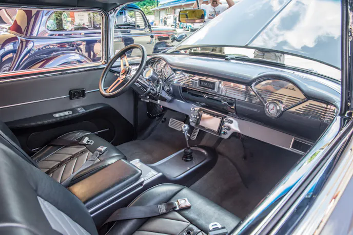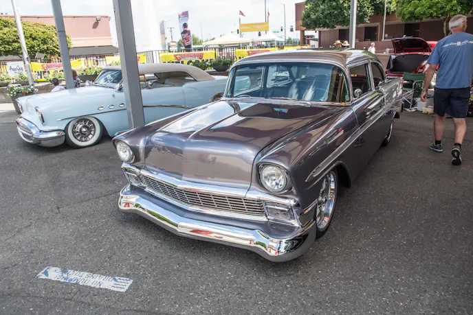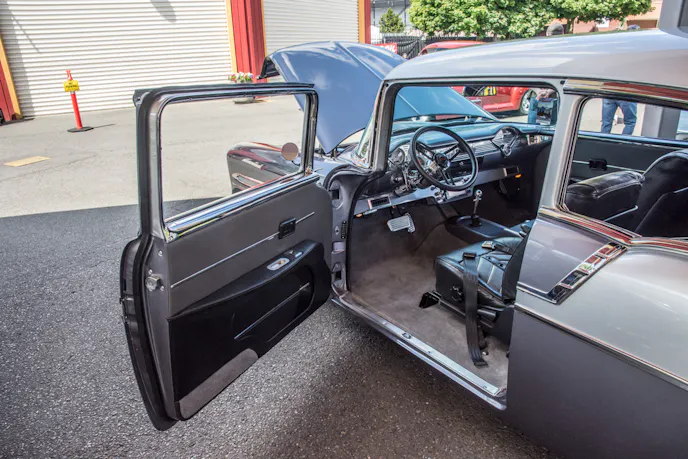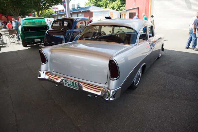 It’s hard to go wrong with a Tri-Five Chevy, especially a ’56 Bel Air. This one caught our eye with its custom look and deep silver paint. The door handles and emblems have all been tastefully removed, and the hood ornament is gone, giving the face of this car a sleeker, more modern look.