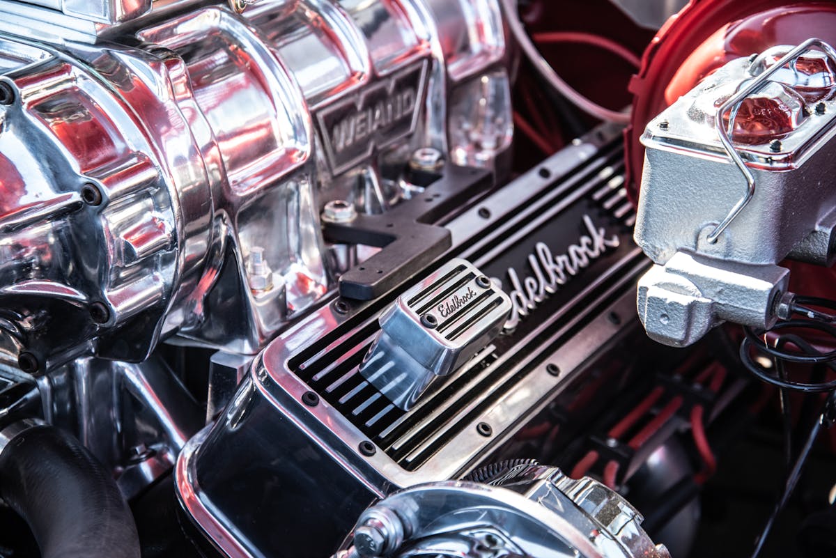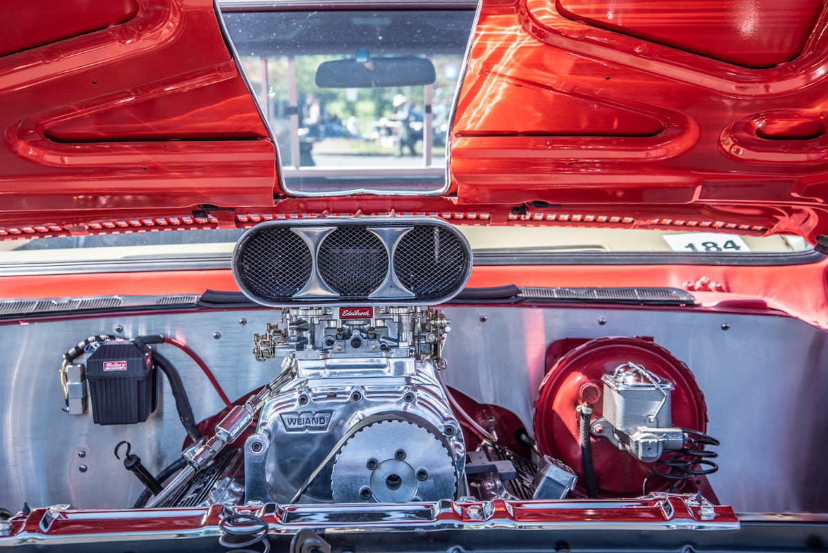 There's nothing like the look of an engine compartment overflowing with chrome and polished aluminum. Notice the inner fender wells are also a smooth and shining chrome surface as well.