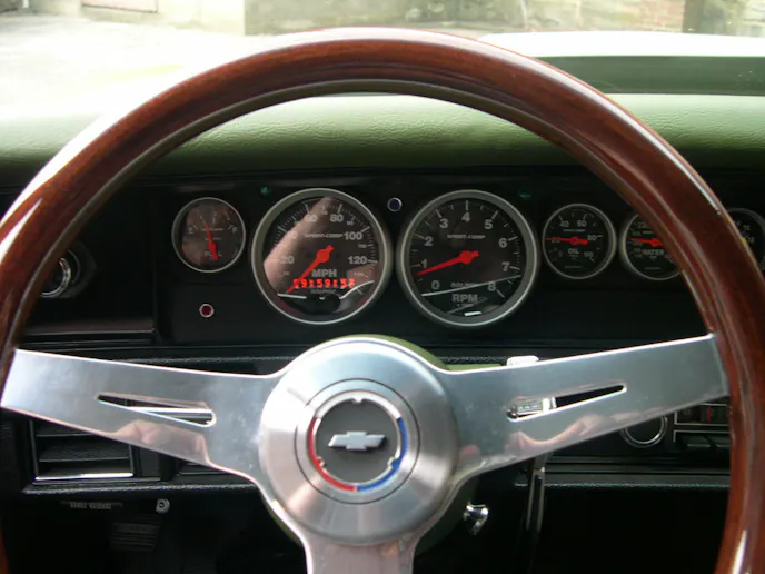 Hank’s car is powered by a mildly-built 396 cubic-inch engine mated to an Auto-Gear M22W manual transmission, and a 12-bolt positraction rearend with 3.55 gearing. Hank kept braking speedometer cables and recently it wasn’t just the cable that broke, but the back of the gauge. After that experience, he opted to go with a modern, GPS gauge system. “I put in an Auto Meter GPS gauge,” he explained, “it picks up pretty well, even in the garage.”
